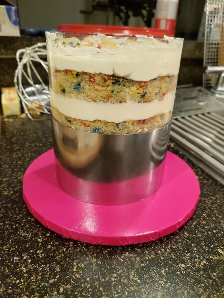 Love these and have twelve. We line the inside with an acetate cake liner and build our cakes inside.