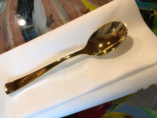 The shiny gold finish and elegant handle give this plastic spoon the appearance of gold-plated silverware. This makes it an excellent choice for weddings and catered events. Treat your guests to a unique dining experience and make each plate feel more luxurious by adding this flatware to your table settings.