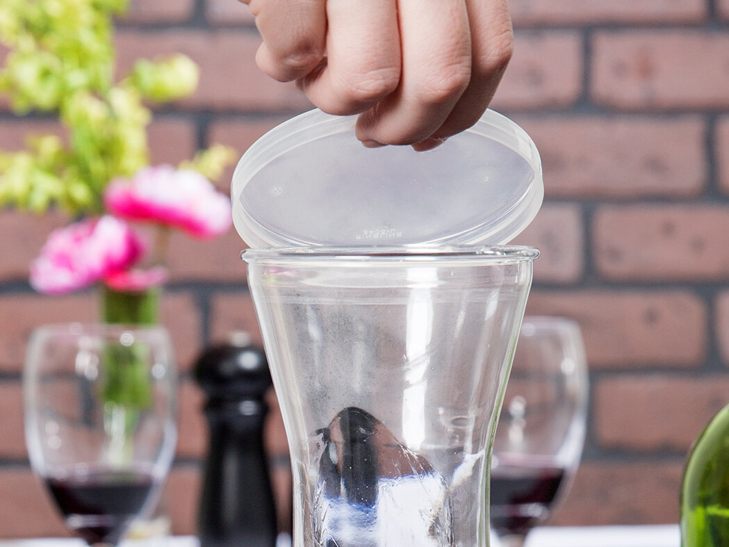Pop on lid keeps spills from staining carpet, fridge, or tile. Durable plastic can take a few drops without cracking or chipping. Excellent for wines and juices.