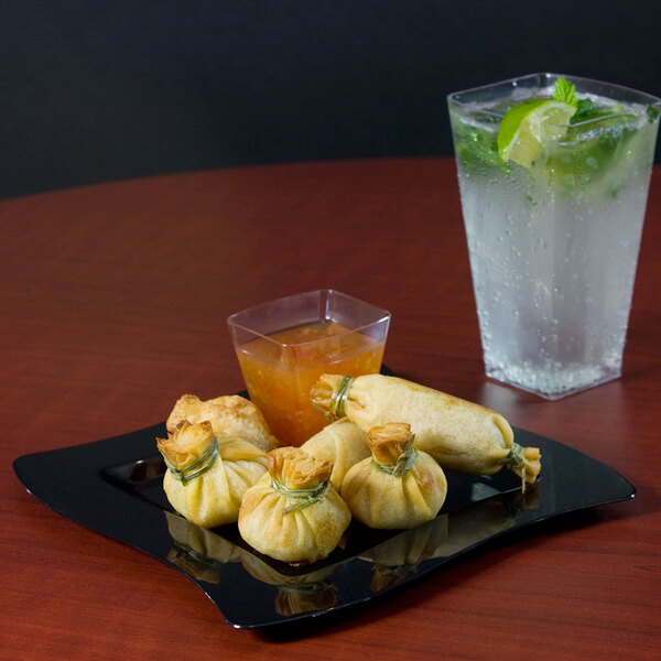 An upscale alternative to standard disposable plates, it offers a trendy and chic look with the convenience of plastic dinnerware. A petite design and sleek black color adds a unique flair to desserts, sushi, and gourmet appetizers.