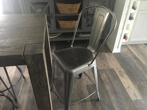 We bought these chairs for our bar. They work great. It comes in 2 pieces, the back of the chair and the stool. It was super easy to put it together as all the tools were included. Even though it is metal they are comfy to sit at for a period of time. The color is great and exactly what we expected. Easy to clean. We would recommend!