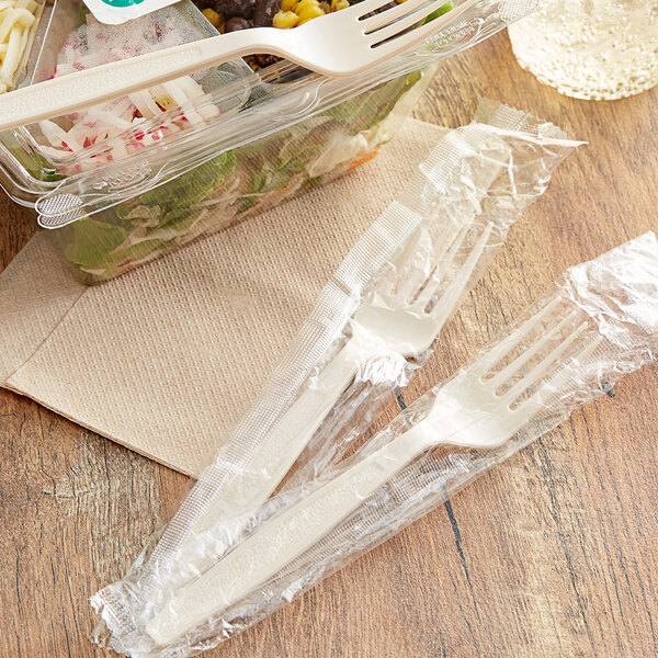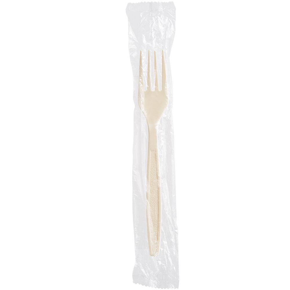 This Choice beige heavy weight wrapped polystyrene plastic fork is perfect for your take-out restaurant, cookout, party, gathering, or other catering event.