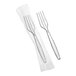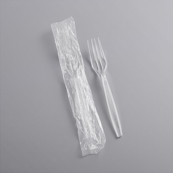 This Choice clear heavy weight wrapped polystyrene plastic fork is perfect for your take-out restaurant, cookout, party, gathering, or other catering event.