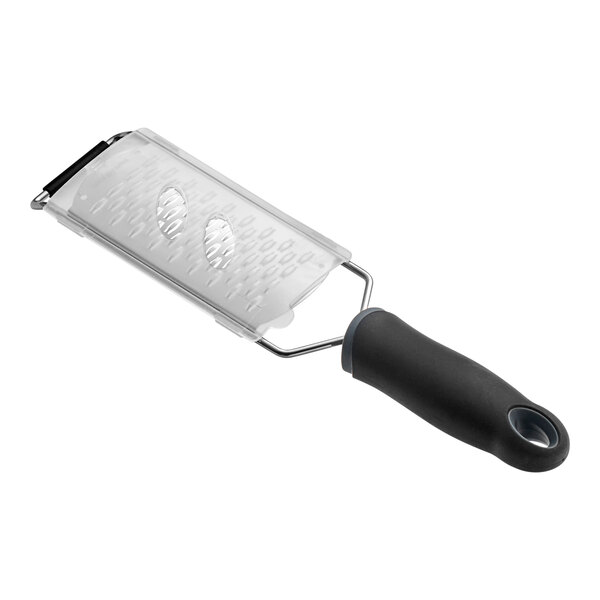 Enhance the flavor and presentation of your dishes with the Fourte 12" stainless steel ribbon paddle grater with a soft grip black handle.
