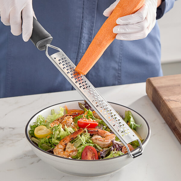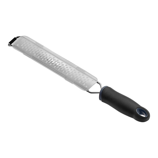 Enhance the flavor and presentation of your dishes with the Fourte 15" stainless steel coarse rasp grater with a soft grip black handle.