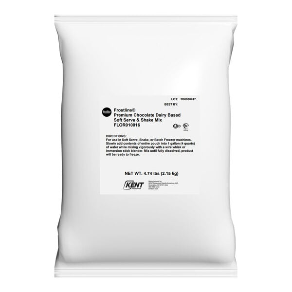 In addition to soft serve ice cream, this mix can be used in granita or milkshake machines to make frozen beverages and shakes, including alcohol-infused beverages for your of-age crowd! Use it to create anything from a simple chocolate shake to a boozy chocolate martini. This shelf-stable dry mix provides easier handling and storage than ready-to-use fresh dairy, and it delivers a more consistent flavor and texture from batch to batch. Best of all, preparation is quick and easy to help you keep up with high demand and ensure optimal freshness when serving. Simply fill a clean mixing bucket with 1 gallon (4 qt.) of cold water and add in 1 bag of Frostline Premium soft serve mix to the bucket. Stir with a wire whisk until the dry mix is completely dissolved. Pour the mixture into your commercial soft serve machine or cover and store in your refrigerator. Each bag yields approximately (47) 2/3 cup servings.