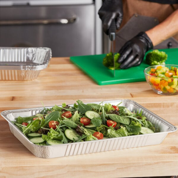 This pan holds up to 228 oz. (approximately 13 lb.) of product, and it features a sturdy aluminum foil construction with a flexible curled rim to bend over a lid (sold separately). It is also stackable for space-saving storage and transport. Once your meal service is finished, simply dispose of the pan for quick and easy cleanup.