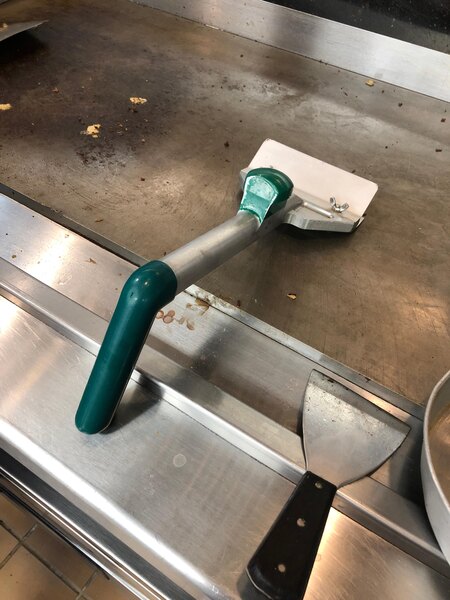 We opted for this grill scraper due to cost restrictions of just starting our food truck nessity over preference. I was pleasantly surprised at how heavy duty and industrious it is. I honestesly thought for a moment upon recieving it I had recieved the heavier duty grill scraper. One piece solid cosructioin.I am thankful for this purchase we also purchased the replacment blade at the same time.