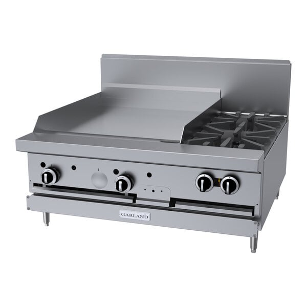 Quickly cook meats, vegetables, and more with this Garland G36-2G24T natural gas 2 burner modular top range with 24" griddle! With a 27 1/4" deep cooking area and 5" deep front countertop ledge, you'll have plenty of space to cook up all of your menu items and keep up with customer demand.