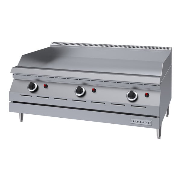This Garland GD-36GTH 36" thermostatic countertop griddle features a piezo spark ignition, 4" sanitary legs, and an 18" deep cooking surface, so you'll have plenty of room to whip up all of your customers' favorites.