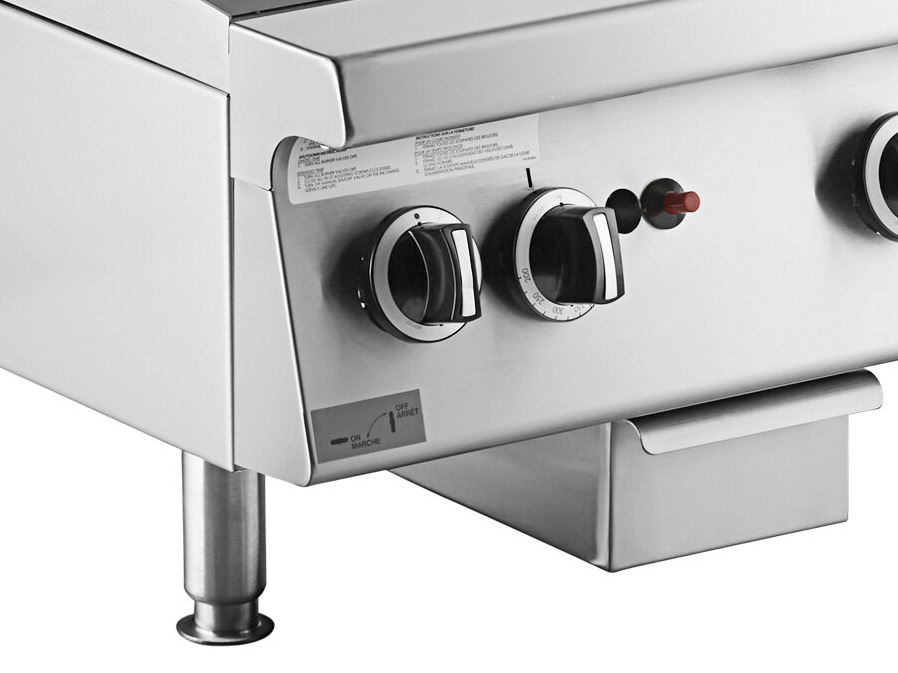 This griddle is powered by natural gas and comes standard with piezo spark ignition. Its thermostatic controls enable precise temperature adjustment from 200-550 degrees Fahrenheit.