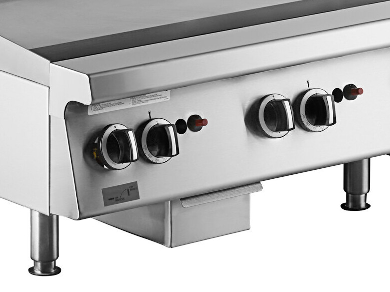 This griddle is powered by liquid propane and comes standard with piezo spark ignition. Its thermostatic controls enable precise temperature adjustment from 200-550 degrees Fahrenheit.