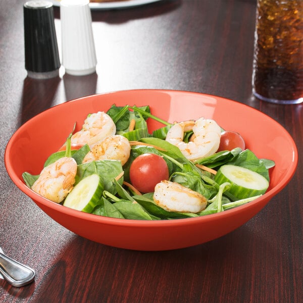 Add an energetic splash of color to your restaurant, catering business, or childcare organization with these GET B-48-RO Diamond Mardi Gras 60 oz. Rio orange bowls. Use these bowls for large portions or family-style serving, such as Caesar salad or spaghetti for the entire table. They are also perfect for presenting large quantities of fresh fruit, pasta salad, nachos or hamburger rolls at a catered event or backyard barbeque. Plus, this rich, Rio orange color is sure to create a unique, vibrant personality at your venue.