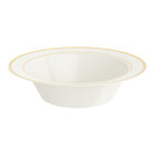 By ordering this Visions Halo sample, you're able to touch and see it in person to ensure it meets all the unique requirements of your foodservice space before committing to the purchase of a full case. Serve your signature sides, salads, and soups on an elegant dish without any of the cleanup with this Visions Halo 12 oz. bone / ivory plastic bowl with gold bands! Featuring a classic gold band pattern along the wide outer rim, this bowl's contrast between rim and bone / ivory body is sure to draw attention while adding an upscale look to your wedding receptions, banquets, or other catered events. This bowl is designed to mimic the look of real china, while providing the convenience of disposability for quick and easy cleanup. Plus, with a versatile 12 oz. capacity, it's ideal for serving not only soups, but sides, salads, and pasta, too!