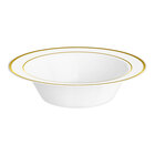 By ordering this Visions Halo sample, you're able to touch and see it in person to ensure it meets all the unique requirements of your foodservice space before committing to the purchase of a full case. Serve your signature sides, salads, and soups on an elegant dish without any of the cleanup with this Visions Halo 12 oz. white plastic bowl with gold bands! Featuring a classic gold band pattern along the wide outer rim, this bowl's contrast between rim and stark white body is sure to draw attention while adding an upscale look to your wedding receptions, banquets, or other catered events. This bowl is designed to mimic the look of real china, while providing the convenience of disposability for quick and easy cleanup. Plus, with a versatile 12 oz. capacity, it's ideal for serving not only soups, but sides, salads, and pasta, too!