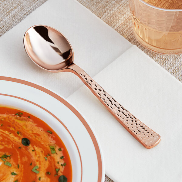 Featuring the look of a rose gold-plated spoon at a fraction of the cost, this Gold Visions soup spoon is the ideal flatware for a variety of applications. Because this flatware is disposable, you won't have to waste any extra time washing large quantities of dishes. Easily add this spoon to the place settings at your banquet, party, or other catered event!