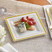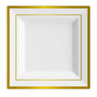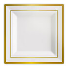 By ordering this Visions Halo sample, you're able to touch and see it in person to ensure it meets all the unique requirements of your foodservice space before committing to the purchase of a full case. Serve your signature appetizers and desserts on an elegant dish without any of the cleanup with this Visions Halo 6" square bone / ivory plastic plate with gold bands! This plate's contemporary, square shape maximizes serving space while its wide rim helps to contain oils, dressings, and sauces to prevent accidental messes and spills. Featuring a classic gold band pattern along the wide outer rim, this plate's contrast between rim and bone / ivory body is sure to draw attention while adding an upscale look to your wedding receptions, banquets, or other catered events. This plate is designed to mimic the look of real china, while providing the convenience of disposability for quick and easy cleanup. Plus, the versatile 6" size is ideal for serving not only hors d'oeuvres, but sides and desserts, too!