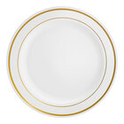 By ordering this Visions Halo sample, you're able to touch and see it in person to ensure it meets all the unique requirements of your foodservice space before committing to the purchase of a full case. Serve your signature appetizers and desserts on an elegant dish without any of the cleanup with this Visions Halo 7" bone / ivory plastic plate with gold bands! Featuring a classic gold band pattern along the wide outer rim, this plate's contrast between rim and bone / ivory body is sure to draw attention while adding an upscale look to your wedding receptions, banquets, or other catered events. This plate is designed to mimic the look of real china, while providing the convenience of disposability for quick and easy cleanup. Plus, with a versatile 7" diameter, it's ideal for serving not only hors d'oeuvres, but sides and desserts, too!