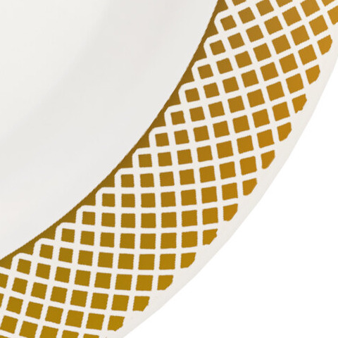 Featuring a contemporary gold lattice pattern along the wide outer rim, this plate's contrast between rim and bone / ivory body is sure to draw attention while adding an upscale look to your wedding receptions, banquets, or other catered events.