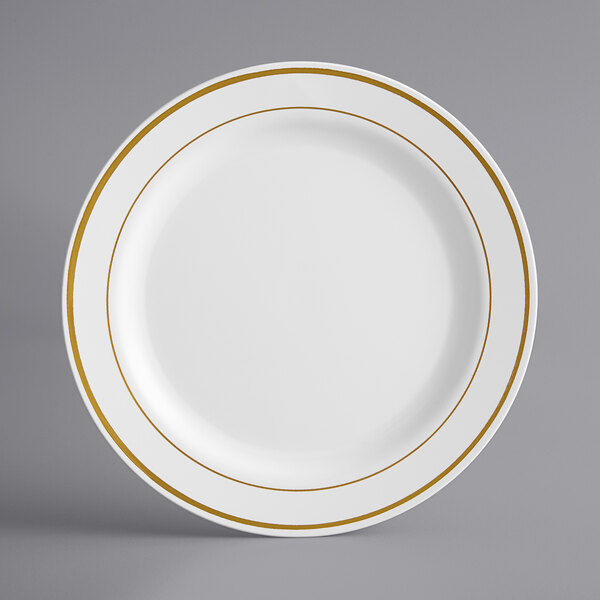 Featuring a classic gold band pattern along the wide outer rim, this plate's contrast between rim and stark white body is sure to draw attention while adding an upscale look to your wedding receptions, banquets, or other catered events.