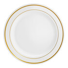 By ordering this Visions Halo sample, you're able to touch and see it in person to ensure it meets all the unique requirements of your foodservice space before committing to the purchase of a full case. Serve your signature salads, sides, and main entrees in an elegant dish without any of the cleanup with this Visions Halo 9" white plastic plate with gold bands! Featuring a classic gold band pattern along the wide outer rim, this plate's contrast between rim and stark white body is sure to draw attention while adding an upscale look to your wedding receptions, banquets, or other catered events. This plate is designed to mimic the look of real china, while providing the convenience of disposability for quick and easy cleanup. Plus, with a versatile 9" diameter, it's ideal for serving not only meat and potatoes, but salads, pasta, and sandwiches, too!