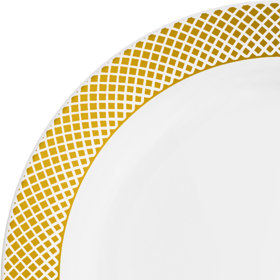 A traditional gold lattice pattern along the wide outer rim serves as a striking contrast to the stark white body of this plate. It's sure to draw attention while adding an upscale look to your wedding receptions, banquets, or other catered events.