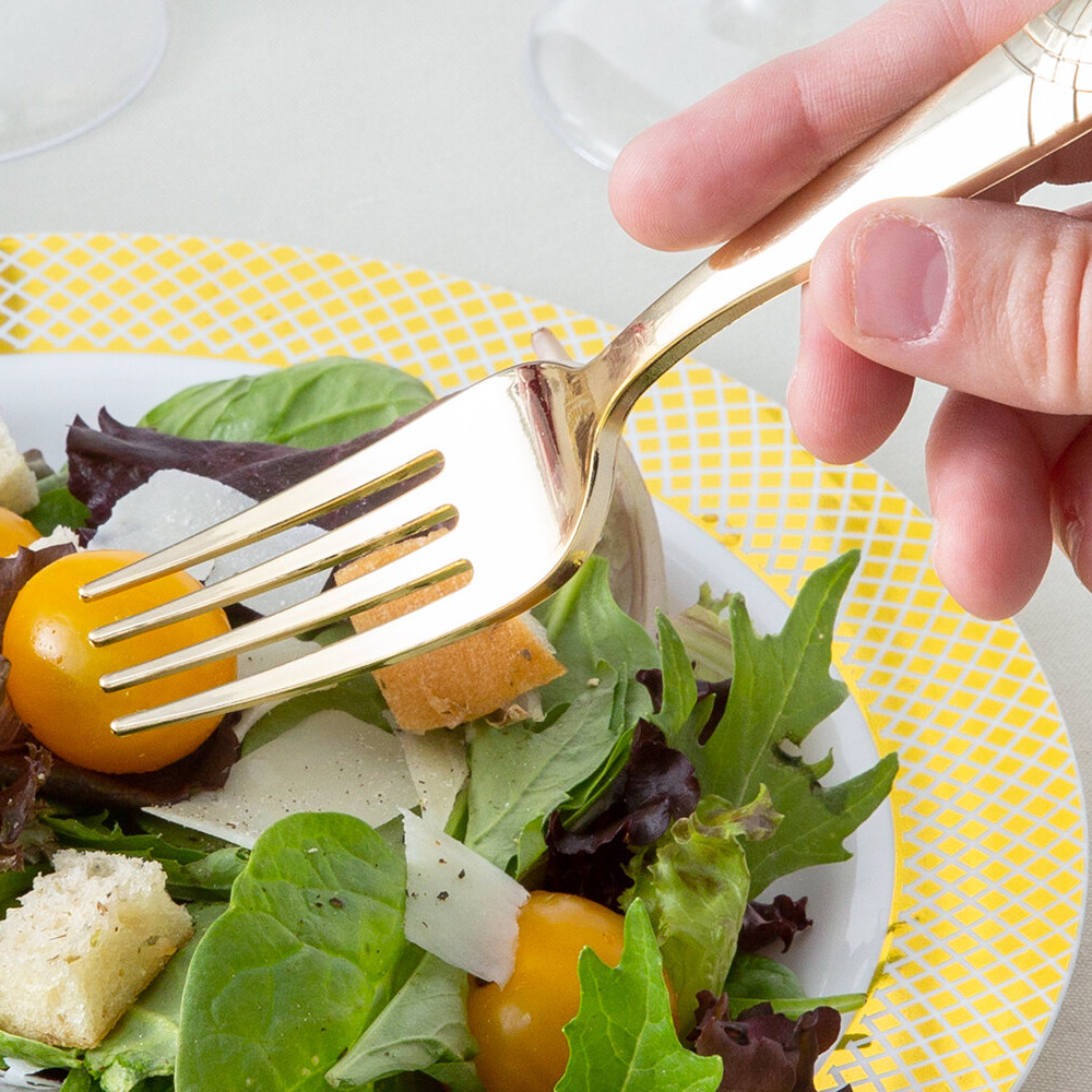 Providing the look of china at a fraction of the cost, this Visions Lattice 9" white plate with gold lattice design gives you the appearance you want with the convenience you need! It's disposable to eliminate time wasted washing dishes and has none of the related storage and transport costs of real china. Plus, the attractive appearance makes it ideal for elegant dining environments where real china simply isn't feasible or desired!
