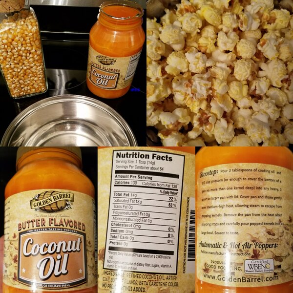Golden Barrel Coconut Oil is useful in many different food concoctions. My original intention was to buy it for our mini theater popcorn popper but we switched over to using it snytime we need a little oil so food doesn't stick to the pan. Granted it's a healthy alternative to many other choices but note it lacks a real noticible butter flavor or much flavor at all. Like anything else if you want to look for healthy alternatives you sometimes sacrifice flavor. That being said we will add a 1/3 tsp of buttery popcorn salt to 1 full cup unpopped popcorn. Just enough not to defeat the so called healthy purchase yet not go overboard. Melts nice & uniform plus the shelf life is great too.