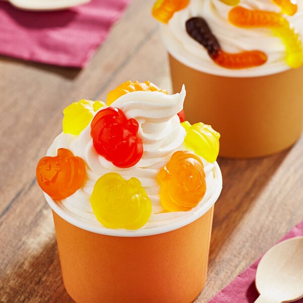 Whether you're creating decadent ice cream sundaes or other sweet treats, you'll find plenty of uses for this bulk supply of gummi pumpkins. You can use them as a sweet garnish for frosted cupcakes and other festive baked goods. When you display items decorated with these gummi pumpkins in your dessert case or show window, their bright fall colors will draw guests in and get them in the mood for autumn shopping! Include these gummi pumpkins in your self-serve ice cream or frozen yogurt bar, and your customers will love seeing seasonal items available to adorn their frozen desserts. They also make a great addition to gift baskets or Halloween candy mixes. Stay ahead of the season by stocking your business with fall-themed treats like this case of (4) 5 lb. fall gummi pumpkin pouches!