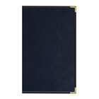 This menu cover boasts a sturdy interior construction, with black leatherette trimmed pockets and smooth gold corners to help hold your inserts in place. Plus, it features a padded vinyl exterior with a stylish blue finish that is sure to impress your guests! It is easy to wipe down at the end of every shift, allowing you to give every guest the best possible dining experience. Use this menu cover to present your offerings in a refined and organized way!