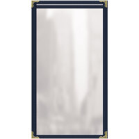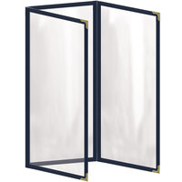 This menu cover boasts a blue double stitched edge for long-lasting use. Its standard decorative gold metal corners also add a dignified and polished touch. Additionally, it is easy to wipe down at the end of the day, allowing you to give every guest the best possible dining experience. The clear, gloss finish of the view panes hides scratches and helps promote excellent visibility, ensuring that customers will be able to easily read your options. Use this menu cover to present your offerings in a refined and organized way!