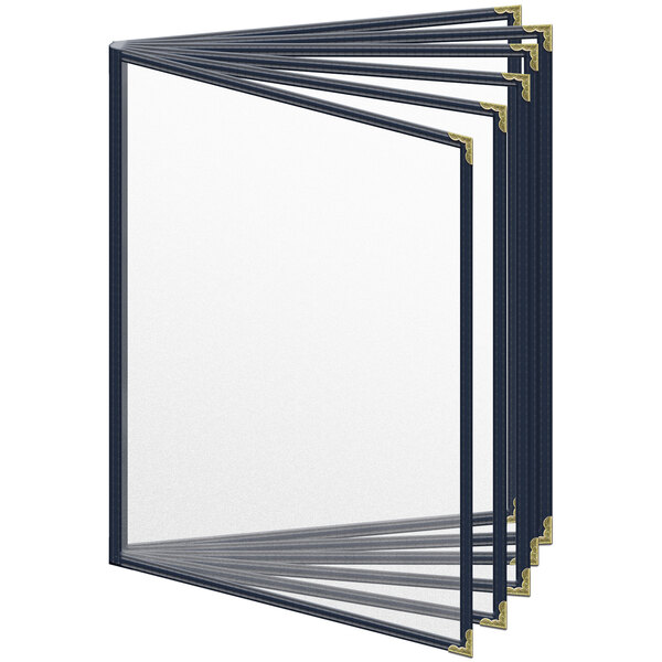 This menu cover boasts a blue double stitched edge for long-lasting use. Its standard decorative gold metal corners also add a dignified and polished touch. Additionally, it is easy to wipe down at the end of the day, allowing you to give every guest the best possible dining experience. The clear, frosted matte finish of the view panes hides scratches and helps promote excellent visibility, ensuring that customers will be able to easily read your options. Use this menu cover to present your offerings in a refined and organized way!