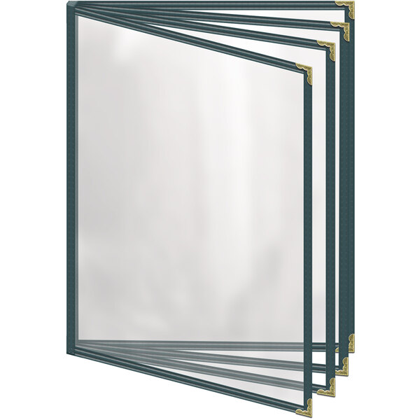 This menu cover boasts a green double stitched leatherette edge for long-lasting use. Its gold decorative metal corners also add a dignified and polished touch. Additionally, it is easy to wipe down at the end of the day, allowing you to give every guest the best possible dining experience. The clear, glossy design of the view panes helps promote excellent visibility, ensuring that customers will be able to easily read your options. Use this menu cover to present your offerings in a refined and organized way!