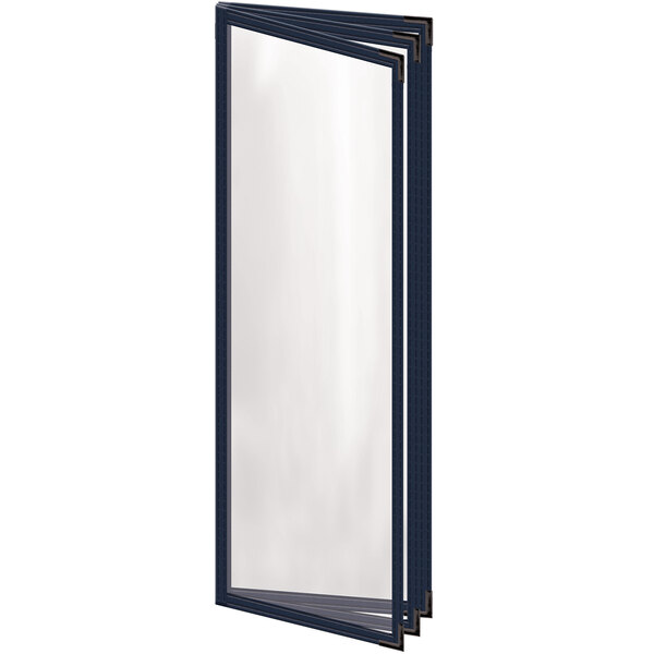 H. Risch, Inc. TETB Deluxe Sewn 4 1/4" x 14" Blue 6 View Vinyl Menu Cover with Black Smooth Corners and Gloss Finish