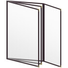This menu cover boasts a maroon double stitched leatherette edge for long-lasting use. Its gold decorative metal corners also add a dignified and polished touch. Additionally, it is easy to wipe down at the end of the day, allowing you to give every guest the best possible dining experience. The clear, matte design of the view panes hides scratches and helps promote excellent visibility, ensuring that customers will be able to easily read your options. Use this menu cover to present your offerings in a refined and organized way!