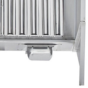 The hood uses (6) 20" x 20" baffle-type filters, and grease is collected in a trough that drains into a stainless steel cup for disposal. 18-gauge 430 stainless steel is used on all surfaces to provide excellent durability while the MIG-welded frame provides seamless, liquid-tight joints. The hood features a sloped-front canopy design that is great for low ceilings, providing extra front clearance and comfort for chefs, and dropping down close to the equipment in the back.