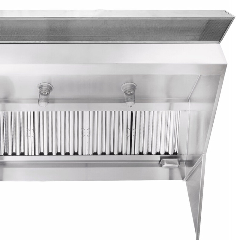 The hood features a sloped-front canopy design that is great for low ceilings, providing extra front clearance and comfort for chefs, and dropping down close to the equipment in the back. This unit is suitable for use over any equipment that has a surface operating temperature under 700 degrees Fahrenheit, and that is required by fire code to have a type 1 hood - this includes fryers, griddles, charbroilers, conveyor pizza ovens, or any equipment that produces grease during the cooking process. The hood removes the grease-laden vapors produced by your equipment and prevents them from accumulating in places where they could become a fire or sanitation hazard, leaving your kitchen clean and safe to use!