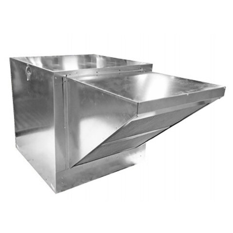 The hood uses (6) 20" x 20" and (6) 20" x 16" baffle-type filters, and grease is collected in a trough that drains into a stainless steel cup for disposal. 18-gauge 430 stainless steel is used on all surfaces to provide excellent durability while the MIG-welded frame provides seamless, liquid-tight joints. The hood features a box-style canopy design to provide superior performance, and a 3" gap on the back of the hood provides clearance and protection for combustible walls where code requires.