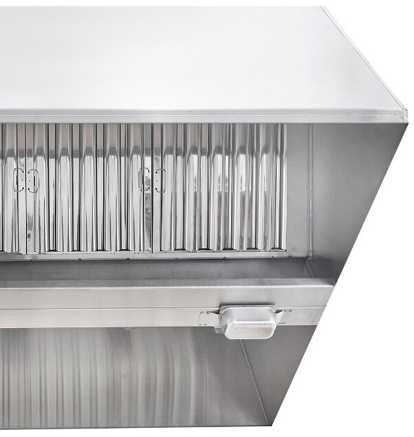 The hood uses (4) 20" x 20" and (4) 20" x 16" baffle-type filters, and grease is collected in a trough that drains into a stainless steel cup for disposal. 18-gauge 430 stainless steel is used on all surfaces to provide excellent durability while the MIG-welded frame provides seamless, liquid-tight joints. The hood features a box-style canopy design to provide superior performance, and a 3" gap on the back of the hood provides clearance and protection for combustible walls where code requires.