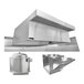 The hood uses (8) 20" x 20" and (2) 20" x 16" baffle-type filters, and grease is collected in a trough that drains into a stainless steel cup for disposal. 18-gauge 430 stainless steel is used on all surfaces to provide excellent durability while the MIG-welded frame provides seamless, liquid-tight joints. The hood features a box-style canopy design to provide superior performance, and a 3" gap on the back of the hood provides clearance and protection for combustible walls where code requires.