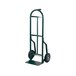 Transporting heavy or oversized items is easier than ever with this Harper 54T86 steel continuous single pin handle hand truck! This model features a welded frame with curved steel straps that support even cylindrical items, while a durable 5/8" axle and 10" x 2" solid rubber wheels allow it to handle up to 600 lb. at a time. Its high-back, continuous design provides added support for tall stacks of items, while a single pin handle lets you maneuver the truck with one hand. Built-in glides help you to ease the load up and down stairs or over curbs, and it features a high strength base plate with a machine-beveled edge that is designed to slide under the load easily! Its durable, yet lightweight, steel frame will provide you with longstanding durability and effortless mobility.