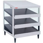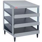 - 3 heated and slanted aluminum shelves; stainless steel box stops for easy pass-through holding