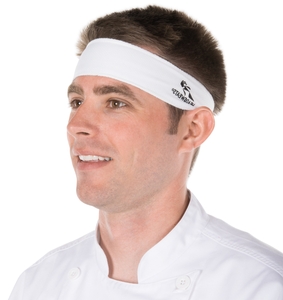Provide maximum comfort and style for your restaurant's kitchen team with the classic styling of this white high-performance fabric headband. Busy chefs and cooks will love the absorbency, especially in a hot kitchen setting. Made with performance fabric, this one-size-fits-most headband also allows for easy custom logo application.