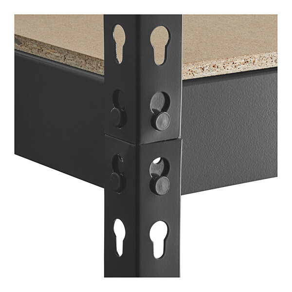 The frame is made of durable riveted steel with a black powder coat finish that provides rust resistance for a longer product life. Each shelf is made of rugged particleboard, too. Since the particleboard shelves are solid, they are great for storing items that might tip over or fall through regular wire shelves or vented shelves.