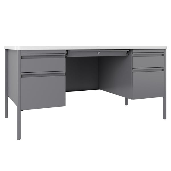 Equip your classrooms or offices with this Hirsh 22655 platinum / white double pedestal teacher's desk. This sturdy metal desk is a professional solution for many business, government, or school applications. With its durable laminate top, this desk looks sleek and modern in many classroom environments. The top provides plenty of space for computer monitors, calendars, paper trays, or even small printers and scanners. Plus, the smooth surface is great for writing. The legs match the metal desk base, and they even have leveling glides to keep the top stable and level when your floors are uneven.