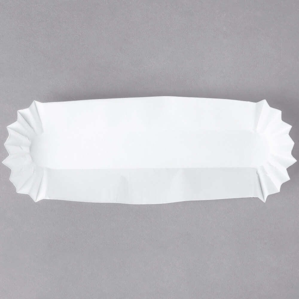 Serving hot dogs at your concession stand, ball park, or take out operation has never been quicker or easier than with this Hoffmaster 610735 10" white paper fluted hot dog tray. This tray provides a convenient to-go serving method for hot dogs that has a classic look customers will love!