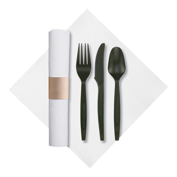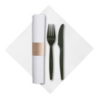 For a convenient yet professional flatware solution, try this Hoffmaster CaterWrap 15 1/2" x 15 1/2" FashnPoint® pre-rolled white napkin and 3-piece compostable black CPLA plastic cutlery set! This cutlery set is pre-rolled and sealed to save you time and effort. This set comes with a black plastic fork, knife, and spoon. These utensils are rolled in a stylish white napkin, providing the ultimate convenience to both you and your patrons. A kraft strap blends function and style to create a cohesive look and keep this set tightly rolled.