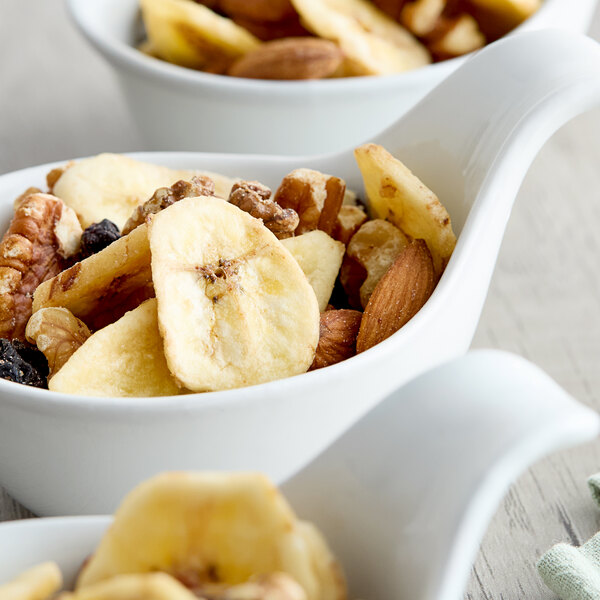 There are countless ways to use these banana chips in your commercial kitchen. Try adding them to trail mix or as a garnish for ice cream and cupcakes. They also make a great snack on their own! For a delicious and nutritious treat, grind these banana chips up and mix them into banana bread or granola. Their natural sweetness makes them a great choice for adding a pop of flavor to a wide range of sweet treats, and they're sure to be a hit with health-conscious customers!
