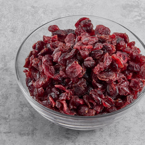 There are countless ways to use these dried cranberries in your commercial kitchen. Try adding them to trail mix, granola bars, or muffins. They also make a great snack on their own! For a delicious and nutritious meal, sprinkle these cranberries over a deli turkey wrap filled with cheddar cheese, spinach, tomatoes, and cucumbers. You can also use these dried cranberries in place of raisins in savory dishes, such as chicken salad. To rehydrate these cranberries, simply soak them in warm water and blend them into your favorite pie filling, dressing, or balsamic glaze. Their natural sweetness makes them a great choice for adding a pop of flavor to a wide range of sweet treats and savory dishes, and they're sure to be a hit with health-conscious customers!