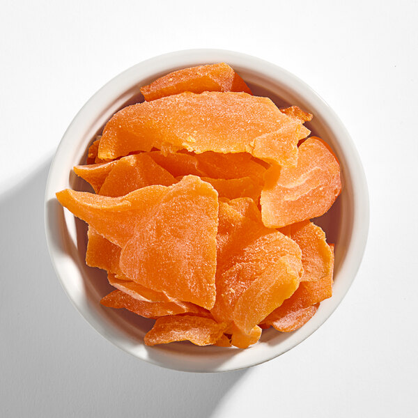 Perfect for creating a range of snacks and baked goods, these dried mango slices are plump and full of flavor. They can be used to add a boost of nutrition, color, and a rich, sweet taste to your regular offerings, or to create unique, signature items that your patrons won't be able to find anywhere else. These mango slices have been sliced, dried, and sweetened with real sugar, creating a sweet and chewy treat. They are rich with antioxidants, vitamins, and fiber, making them a great snack choice for health-conscious customers. Packaged in a bulk 11 lb. bag, these dried mango slices are easy to store and have a longer shelf life than fresh or frozen mangoes, making it easier for you to keep these popular fruits on hand year-round.